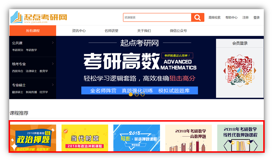校园网IP范围内的任意电脑(南北校区无线网、电子阅览室、行政办公区),进入图书馆首页——“资源”栏目下——数据库总览——“试用数据库”——进入“起点考研网”,或直接输入网址“http://www.yjsexam.com/main”,进入网站即可学习所有课程,首页界面的中间部位“课程推荐”中有各个科目的压题内容。