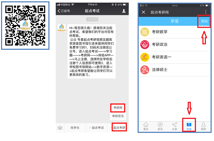 扫描下方二维码,进入“起点考试”公众号,点击右下角“起点考研”,选择“考研网”,点“马上体验”进入,注册,点击下方“课堂”,在点右上角“添加”,添加自己需要的考试科目。选择好之后,返回课堂界面,再进入相应的科目。